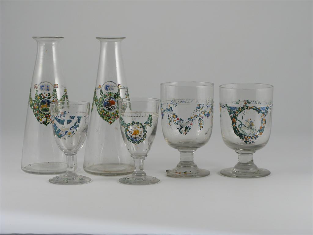 A part set of enamelled wine glasses possibly decorated by Gertrude Bayes, comprising two decanters, two wine goblets and two water goblets, each enamelled with floral swags and animals the glasses dedicated Gertrude and Gilbert Bayes, the decanters with GB roundels losses to enamels, chips to foot rim of one wine and one water goblet decanters 22cm. high