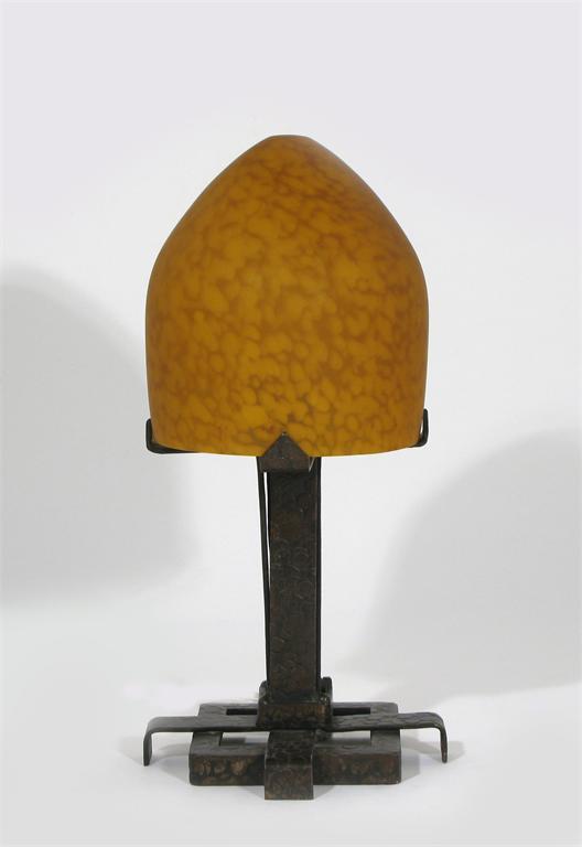 A wrought iron and glass desk lamp in the manner of Edgar Brandt, unsigned 34.5 cm. high