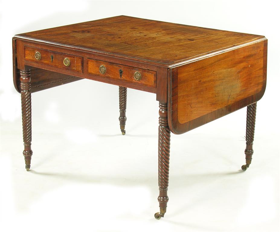 A Regency mahogany sofa table, the rosewood cross banded flap top to two frieze drawers, ash and cedar lined, reverse with false drawers fitted later brass plate handles on spiral ribbed legs to brass castors possibly Irish, 28in (71cm) h, 37in (94cm) closed, 32.5in (82.5cm) d.