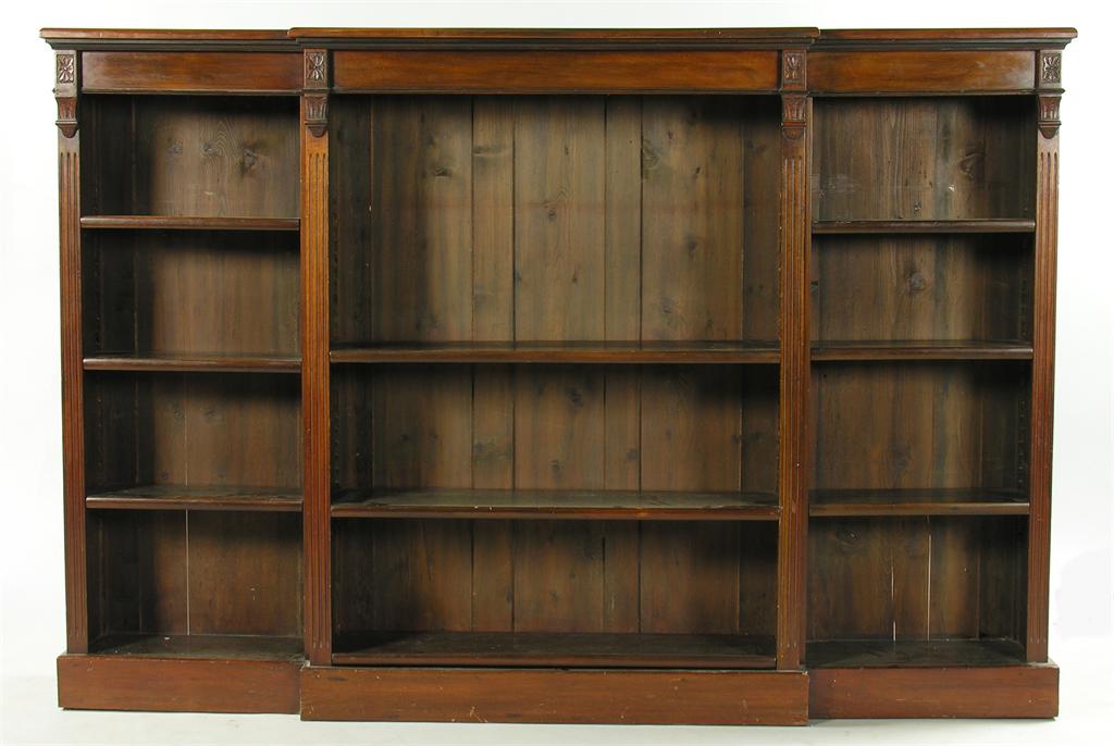 An Edwardian mahogany breakfront open bookcase, with adjustable shelves, 48.5in (123.2cm) h, 72in (183cm) w, 13in (33cm) d.