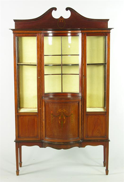 An Edwardian mahogany display cabinet, inlaid stringing, parquetry and marquetry decoration and having a fabric lined interior, 66in (167.5cm) h, 45in (114.4cm) w, 14.5in (37cm) d.