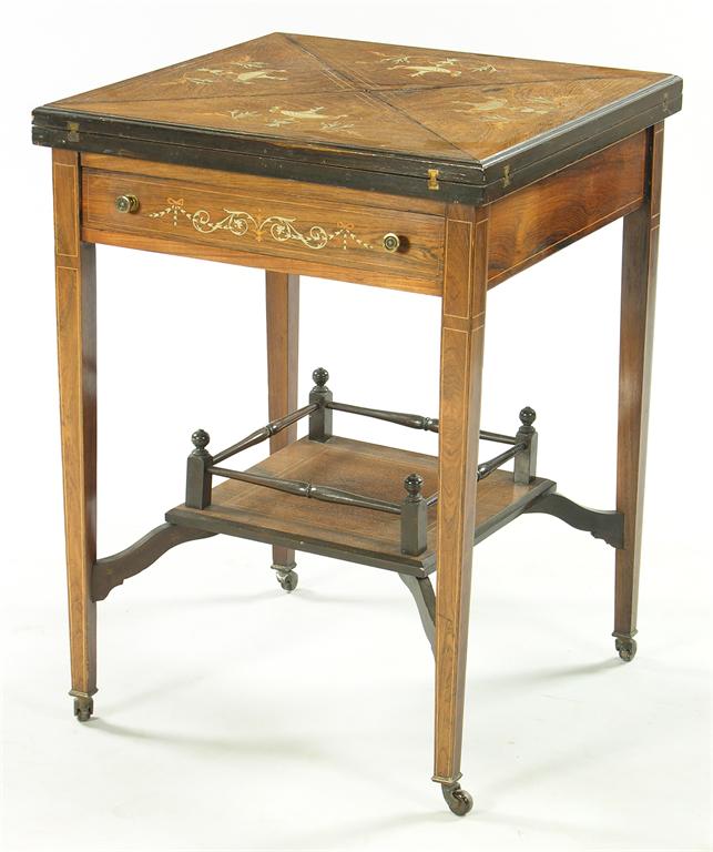 A late Victorian rosewood and marquetry inlaid envelope card table