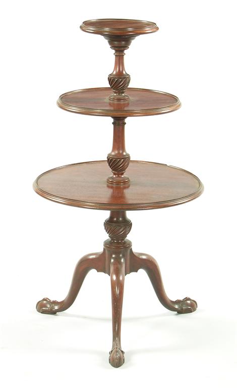 A late George III mahogany three tier dumb waiter, the middle and lower tier revolving, 41in (104.2cm) h, 23in (58.4cm) w.