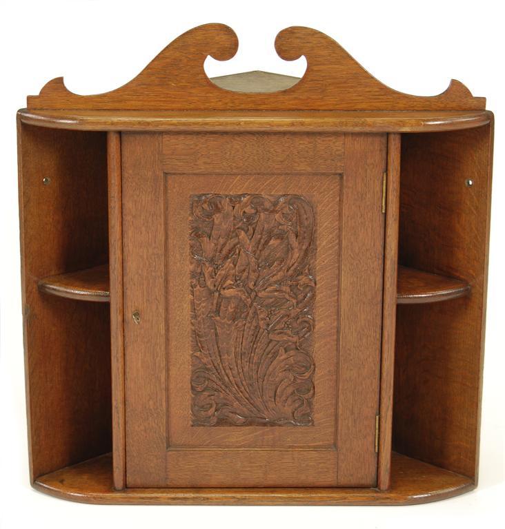 A carved oak corner cupboard, in the manner of Arthur Simpson, with carved foliate panel unsigned 63cm. high