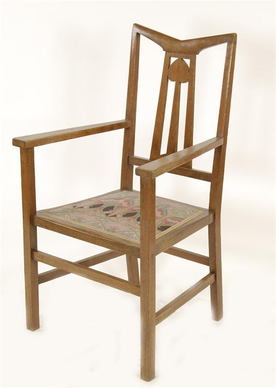 An oak armchair retailed by Goodyers, Regent Street with pierced hear-shaped foliage back splat, textile padded seat applied ivorine label 109 cm. high