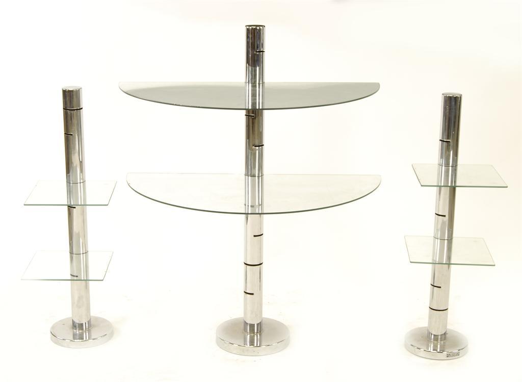 An Art Deco Multiform chromed metal display stand, three cylindrical stems with various glass interchangeable glass shelves applied labels 106 cm. high