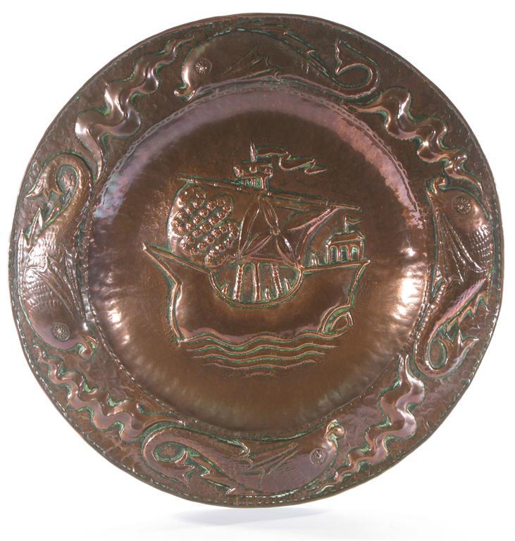 A good John Pearson copper charger repousse hammered with a galleon at sail to the well, the rim with a frieze of four dolphins, stamped JP mark 42.5cm. diam.