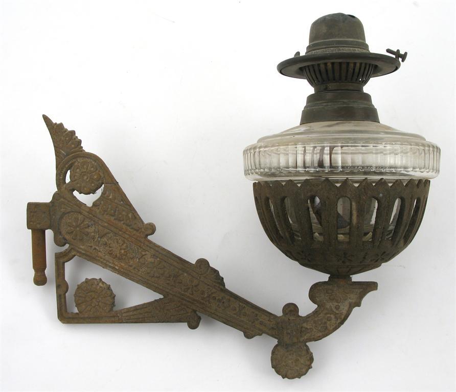 A set of three Gothic Revival cast iron wall lights, with hinged wall brackets, cast in low relief with stylised foliage, with glass oil reservoirs, and another similar stamped Rd mark 33.5 cm. wide