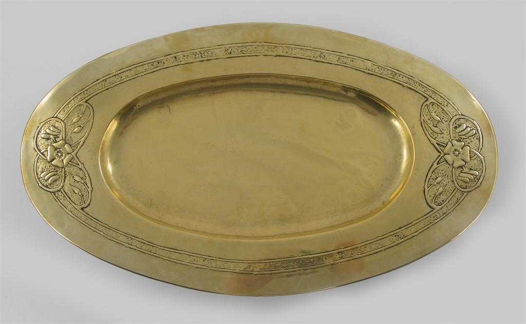 A Glasgow School hammered brass tray elliptical form