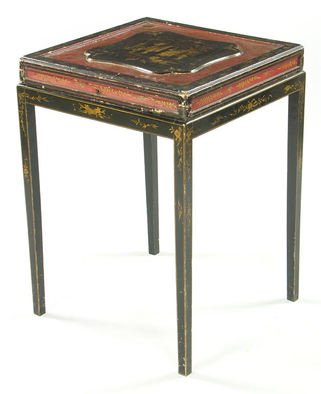 A late 19th century Chinese lacquer shawl box on stand, the hinged top with a paper trade label, 'SUN-SHING DEALER 100 SILKS....' HONG KONG, NO.66 Queen's Road...' 30in (76.2cm) h, 21.75in (55.2cm) w, 22in (56cm) d.