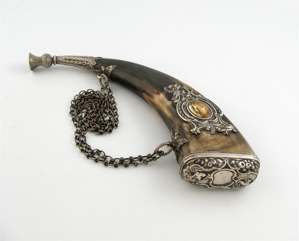 A 19th century Scottish silver dress powder flask, unmarked, the silver silver mount with a hound and fox amongst foliate scroll decoration, the pressed horn body with a thistle terminal, and with a chain, length 30cm.
