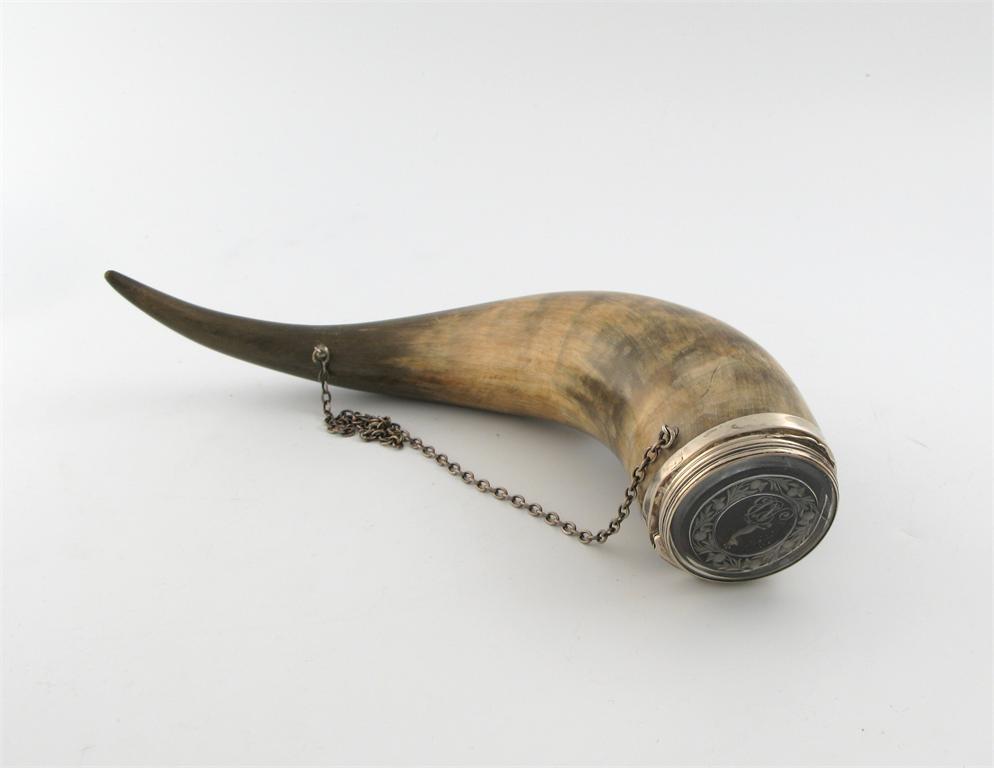 A 19th century Scottish silver dress powder flask, unmarked, the hinged cover set with an engraved glass crest and motto with a thistle border, cracked, length 31cm.