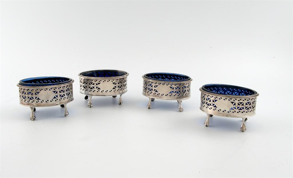 oval form, pierced scroll decoration, beaded borders, on four claw and ball feet, with blue glass liners, length 8cm, approx. weight 6oz. (4)