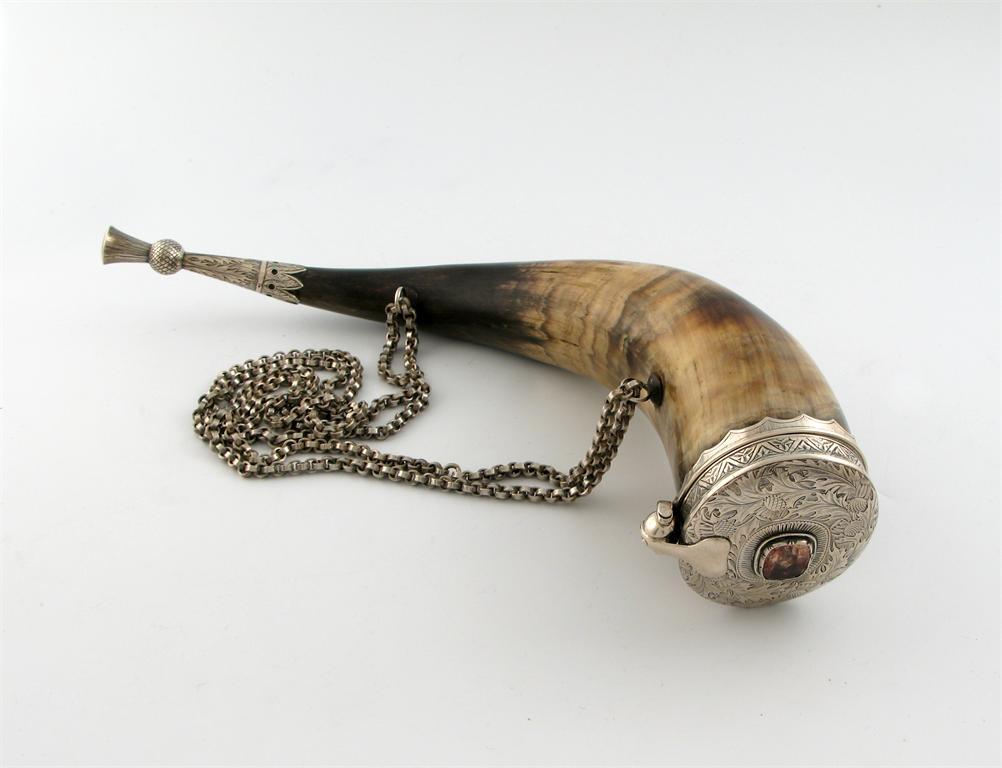 A 19th century Scottish silver dress powder flask, maker's mark ACF, the hinged cover with chased thistle decoration and set with a Cairngorm, the horn body applied with a vacant cartouche and terminating in a thistle end, with a chain, length 38cm.