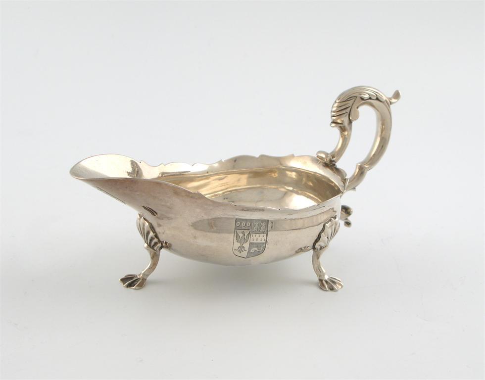 An 18th century Scottish silver sauce boat, by Milne and Campbell, Glasgow circa 1760, oval form, wavy edge border, leaf capped scroll handle, on three paw feet, engraved with later armorials, length 18.5cm, approx. weight 6oz.