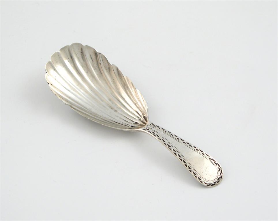 fluted shell bowl, the handle with bright-cut decoration, length 9.5cm.