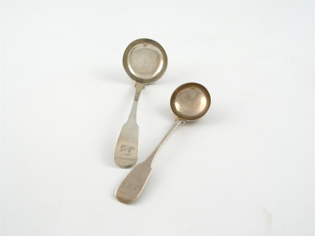 A 19th century silver Fiddle pattern toddy ladle, with unascribed marks, probably Scottish, the terminal monogrammed, plus another Fiddle pattern ladle, approx. weight 2oz. (2)