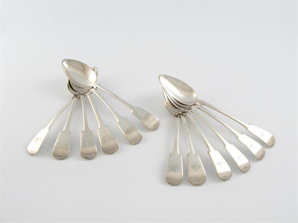 A set of twelve early 19th century Scottish provincial silver Fiddle pattern dessert spoons