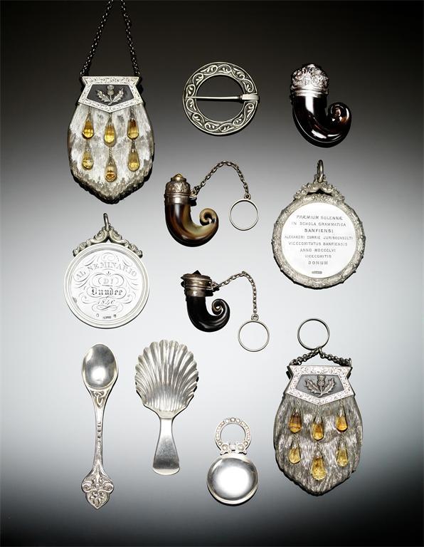 modelled as a sporran, hinged cover with a slide clasp, with six carved yellow glass tassels, and mounted with a thistle, with a carrying chain with a finger ring, length 8.2cm, approx. weight 2oz.