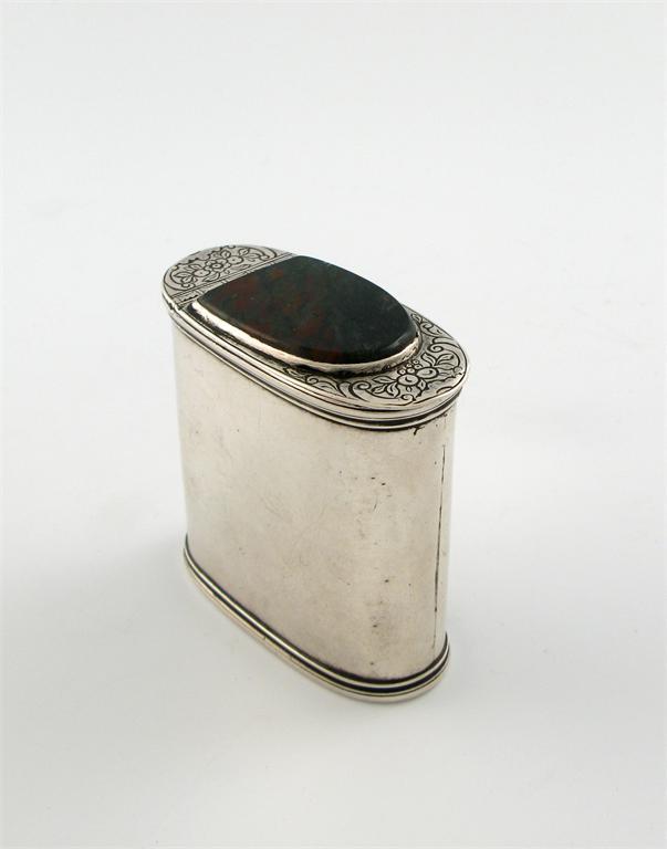 A late 18th / early 19th century silver snuff box, maker's mark partially obscured, probably Scottish, oval cylindrical form, the hinged cover set with a hardstone and with chased foliate scroll decoration, height 6.8cm.