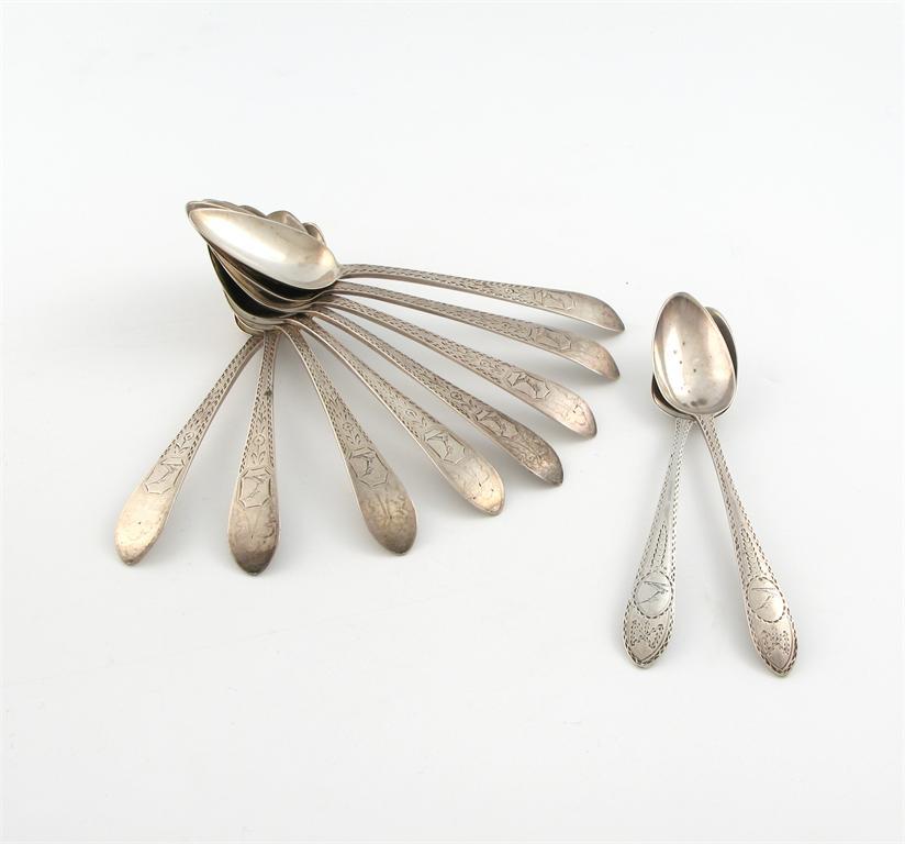 A set of eight George III Irish silver Bright-cut dessert spoons