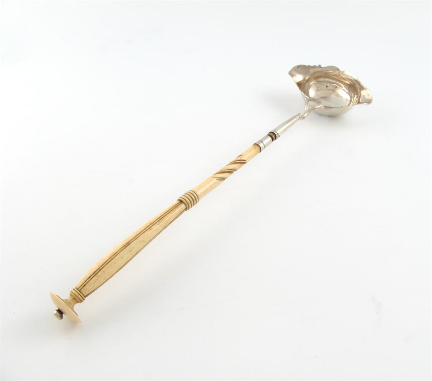 An 18th century silver toddy ladle, maker's mark only, possibly for Kerr and Dempster, oval double lipped bowl, wavy edge border, bi-frucated mount with a turned ivory handle, length 39.5cm.