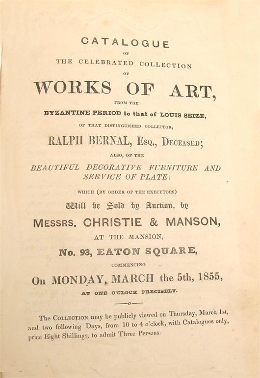The Bernal Collection, Christie Manson & Woods: Catalogue of the celebrated collection of Works of Art of that distinguished collector Ralph Bernal, Esq, Deceased also beautiful decorative furniture and service of plate to be sold at 93 Eaton Square on Mondon March 5th 1855 (a bound catalogue).