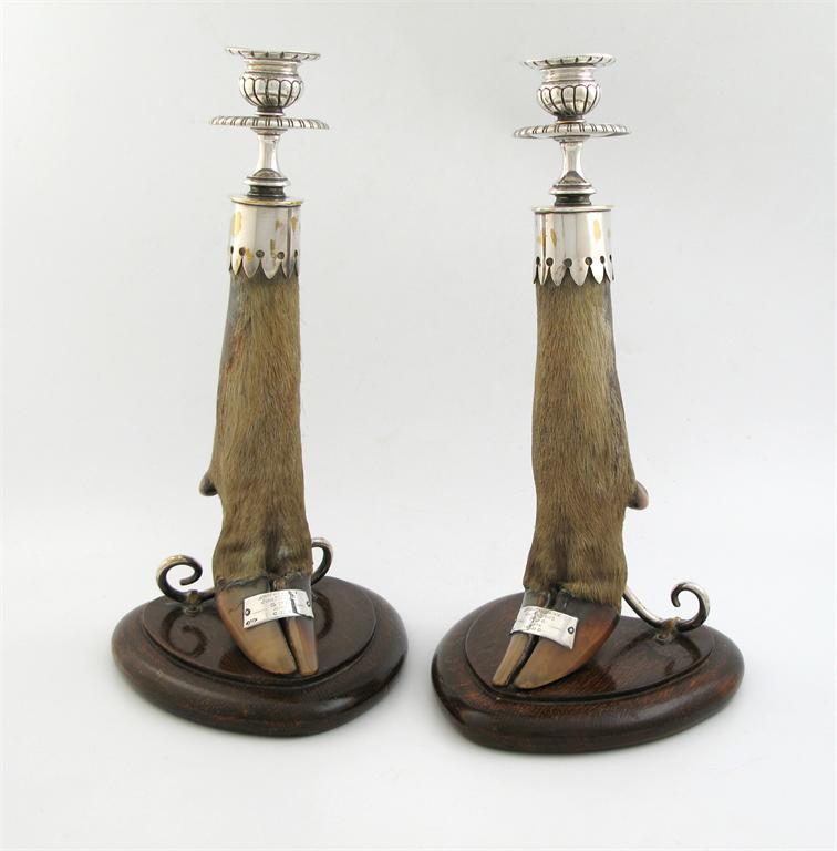 Hunting Interest: A pair of late Victorian electroplated mounted deer foot candlesticks