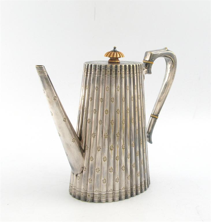 An electroplated coffee pot, no maker's mark, of tapering, reeded oval form, decorated all over with engraved stars, flush-fitting cover, knop finial, height 21.8cm.