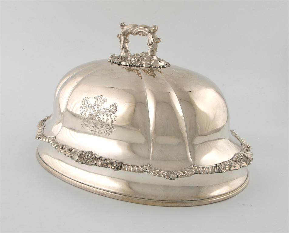 oval form, shell and gadroon border, detachable scroll handle, engraved with a coat of arms, length 34.5cm.