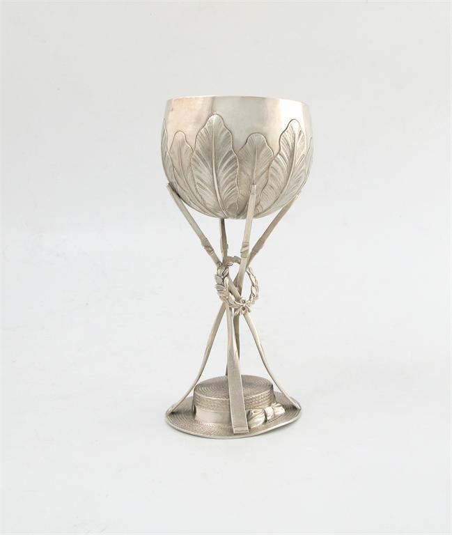 A Victorian novelty electroplated rowing trophy, by James Dixon and Sons, the circular bowl with acanthus leaf decoration, supported by three crossed oars and with a laurel wreath, the base modelled as a boater hat, height 20.2cm, re-plated.