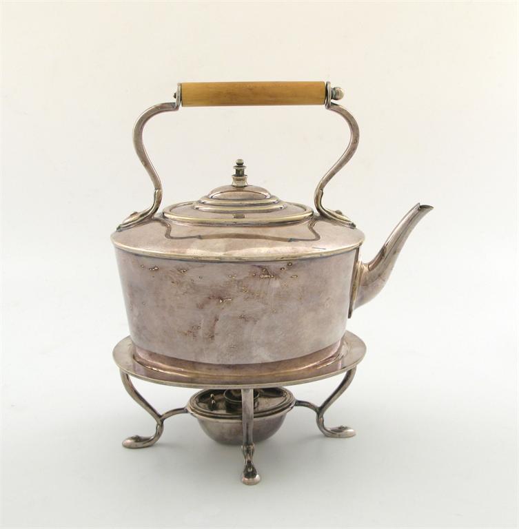 An electroplated kettle on stand, oval form, central ivory handle, on an oval stand on four scroll feet, height 24.5cm.