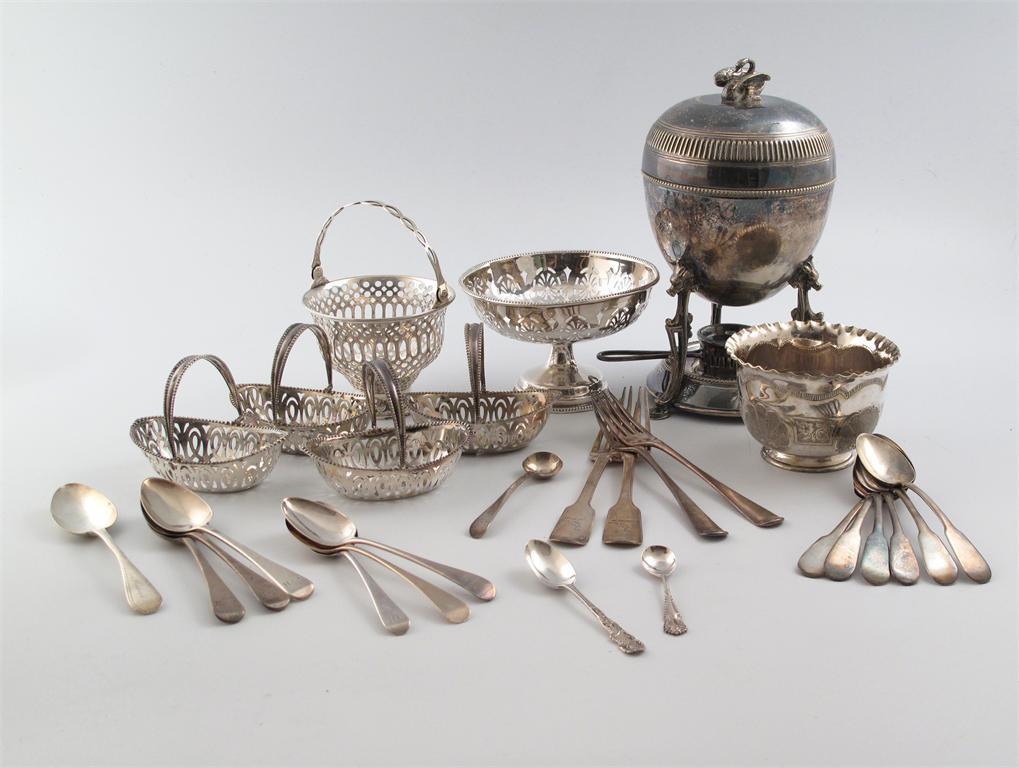 comprising silver items, a set of four pierced swing-handled bon bon baskets, a pierced basket, a bon bon dish, four dessert forks, fourteen tea spoons, and two condiment spoons, approx. weighable 18oz, plus an electroplated egg coddler and a bowl. (qty)