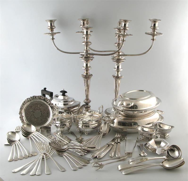 candelabra. A quantity of assorted electroplated ware including: a pair of twin branch candelabra
