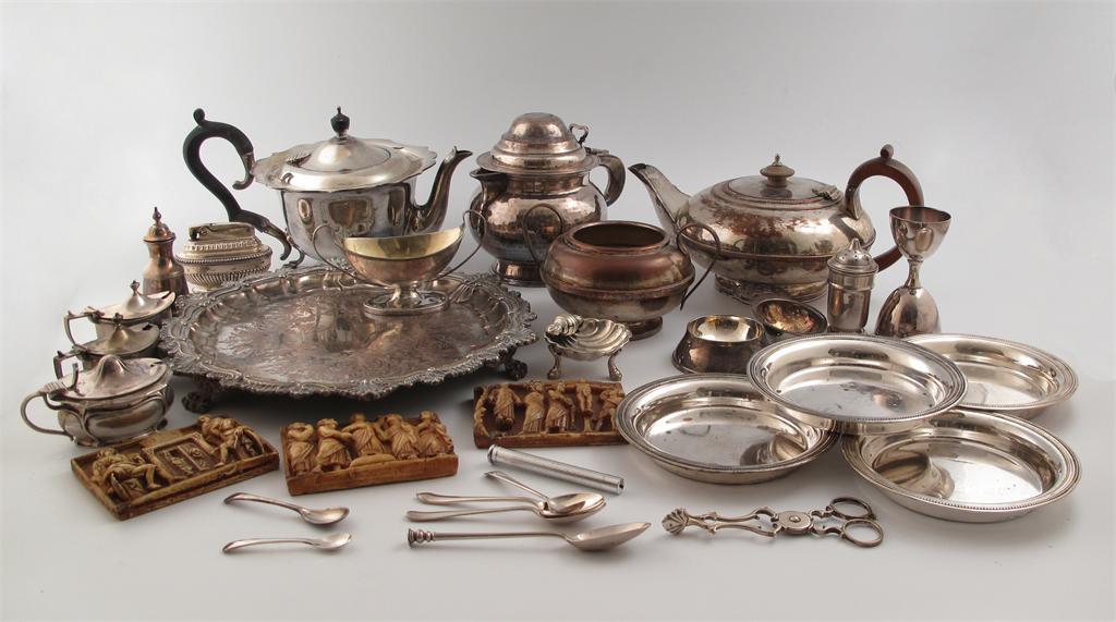 comprising silver items, a George III silver salt, London 1798, three mustard pots, a pepper pot, and a pair of sugar nips, plus a small quantity of electroplated items: a hot water pot, two tea pots, a salver, and other items and three panels, approx. weighable 11oz. (qty)