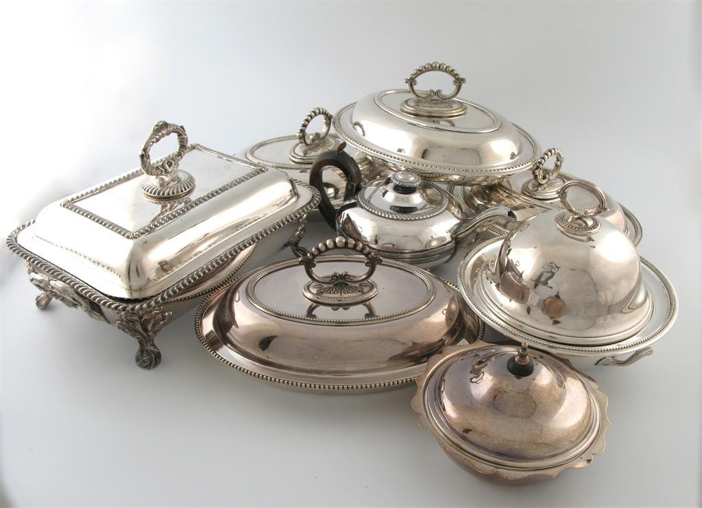 A mixed lot of electroplated items, comprising: a pair of oval entree dishes and covers, two single oval entree dishs, a rectangular entree dish, cover and warming stand, a teapot, two muffin dishes and covers. (qty)