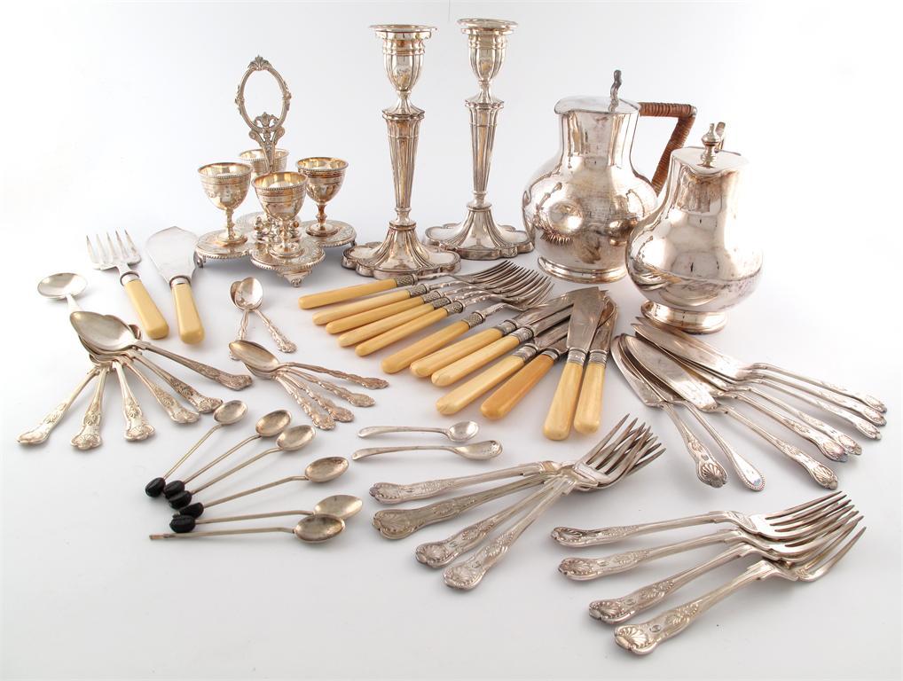 A mixed lot of electroplated items, comprising: a pair of candlesticks, of tapering shaped oval form, an egg cruet stand, two water jugs and other items including flatware and fish eaters. (qty)