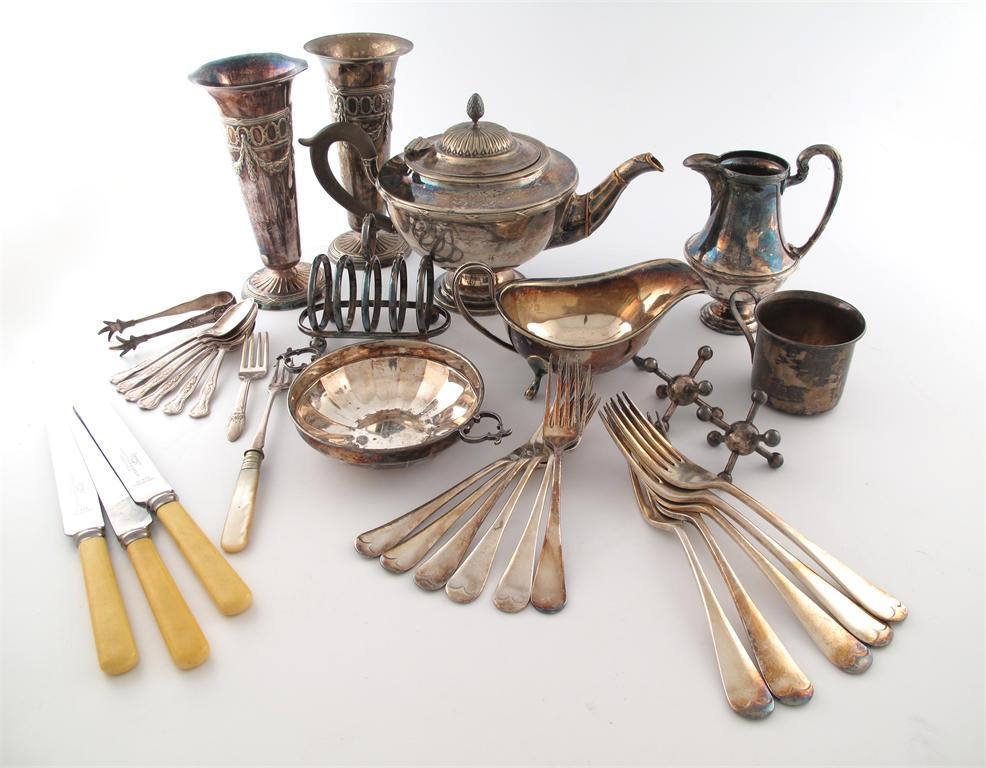 A mixed lot of electroplated items, comprising: a pair of vases, a tea pot, a cream jug and sugar bowl, a pair of oval sauce boats,various entree dishes, a toast rack, a cruet set, and other items including a small quantity of flatware. (qty)