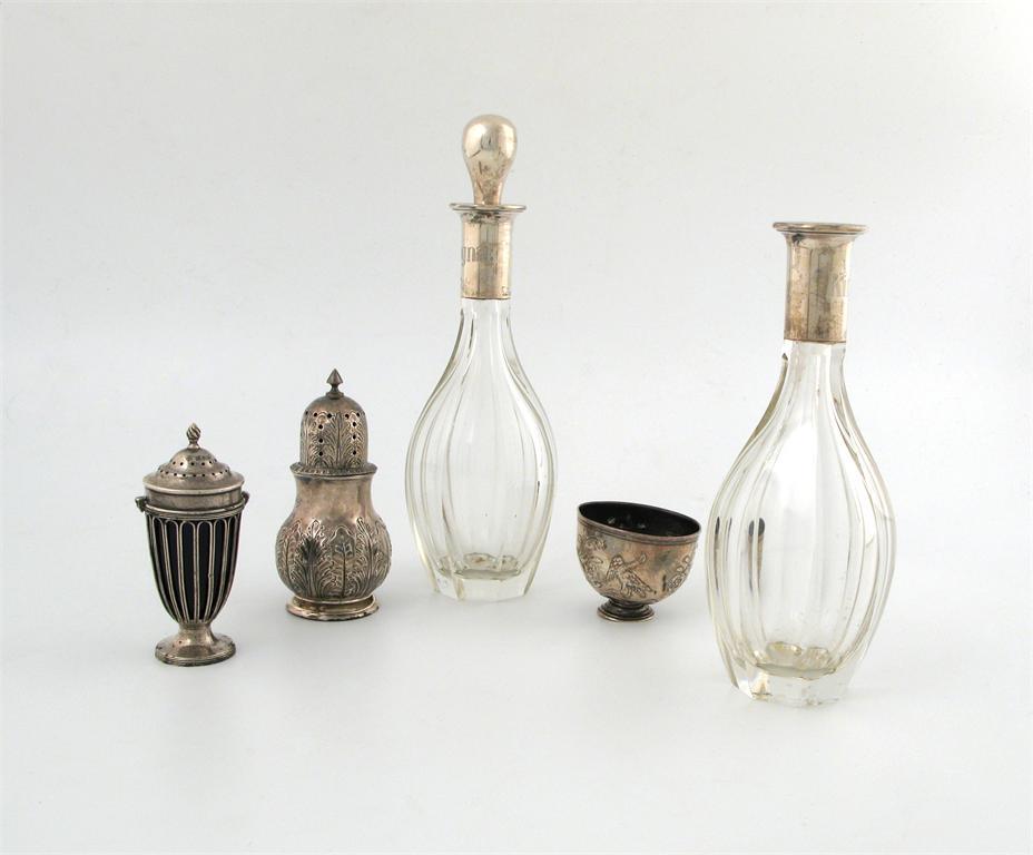 A mixed lot including: A pair of cut-glass German liqueur bottles with slender necks and silver...