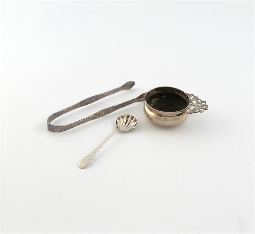 with a fluted bowl, plus a small silver porringer, London 1907, and a pair of old Sheffield plated sugar tongs. (3)