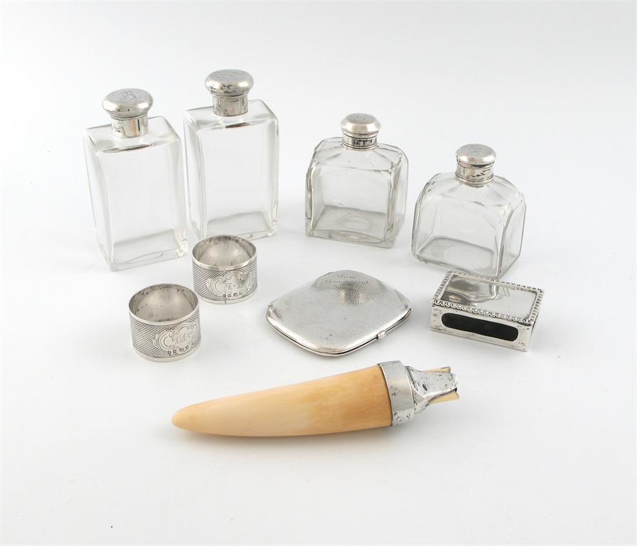 A mixed lot of silver items, various dates and makers, comprising: two pairs of silver mounted scent bottles, (one cracked), a cigarette case, a match box, two napkin rings and a silver mounted ivory handle. (9)