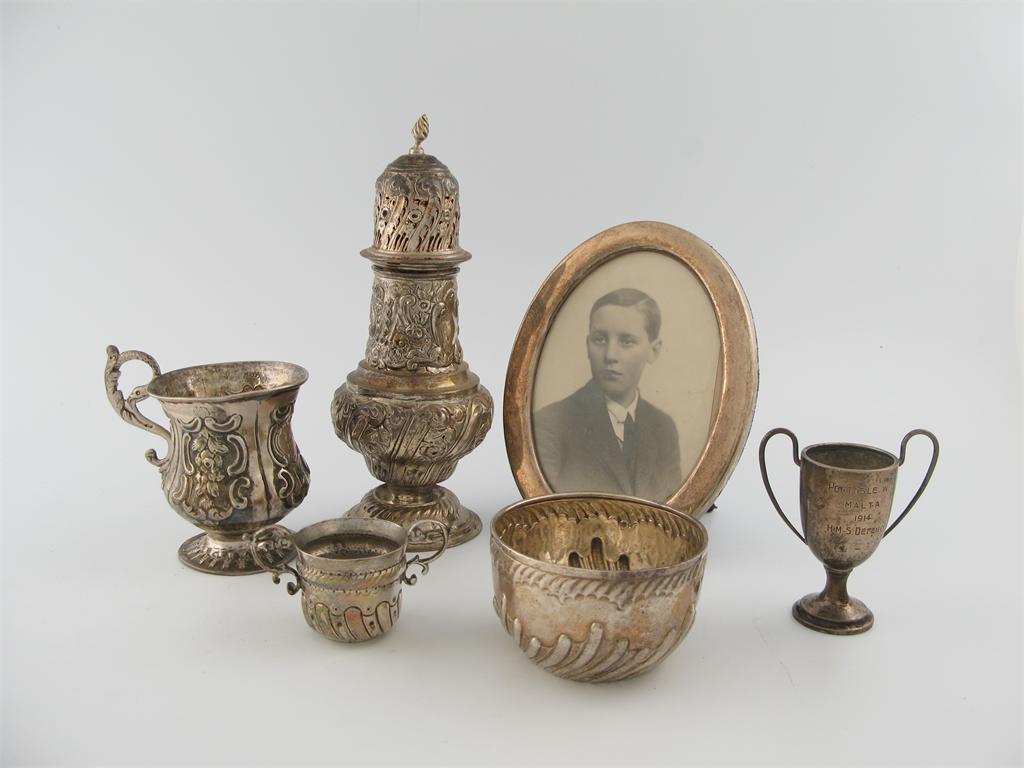 a Victorian miniature porringer, by John Septimus Beresford, London 1890, a half-fluted bowl, by Charles Stuart Harris, London 1884, embossed small mug, an embossed baluster caster, by George Nathan & Ridley Hayes, Chester 1907, a small two-handled presentation cup and an oval photograph frame,