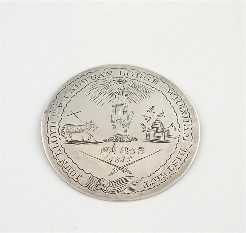 Friendly Society, Cadwgan Lodge, Wrexham District, No. 853, John Lloyd, PG, engraved silver roundel or badge, 1835, all-seeing eye above central heart-on-hand, Holy lamb and beehive, crossed swords below.
