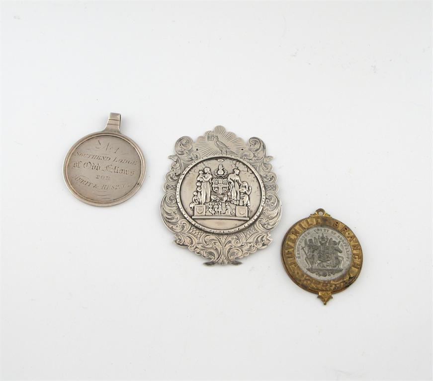 Order of Oddfellows, a presentation silver jewel or badge, engraved foliate border with hour-glass and scythe at top and crossed quills applied below, central armorial medallion, rev engraved " ... To P. G. John Martin ... Loyal Myrtle Lodge ... March 8th 1858", maker S. H / D. C [Samuel Hayne & Dudley Cater], London, 1857, 99 x 76mm; with engraved silver star, 1887, "Presented by Jacques Delmonte to L Roth President, June 1887", two makers marks, HP and F & H, 62mml a Shooting Medal for Archery and Rifle, awarded 1846. applied rampant lion, rev engraved inscription. brooch mounted, 50mm; and clan badge, Cochrane, VIRTUT[E] ET LABORE, a Horse passant, 51mm.