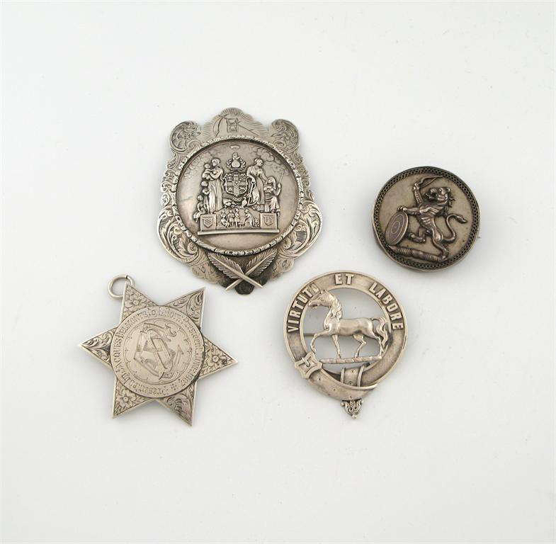 Order of Oddfellows, a presentation silver jewel or badge, engraved foliate border dove with bible in beak at top, central armorial medallion, rev engraved " ... To P. G. John Wilson by the Loyal Watkin Lodge, No. 2396 for his Meritorious Conduct", maker TS, possibly Thomas Settle, 1845, Sheffield, 104 x 82mm; a circular Jewel or Badge "For merit & Respect". No1 Southern Lodge, named on reverse, "Rob t Godward PG" maker W.M [William Moulson or Walter Morrisse], London, 1851, wide suspension loop, 57mm; and a "Jewel" for the Manchester Unity Lodge, white metal within brass border, 53mm.