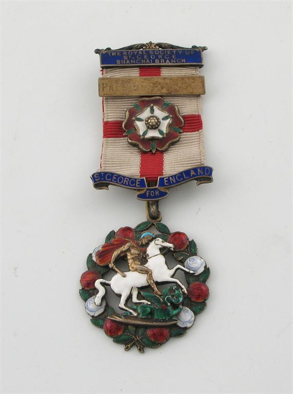 Shanghai Branch, silver-gilt and enamel, St. George slays dragon within border of red and white roses, rosette on ribbon, , in case of issue. Good very fine.