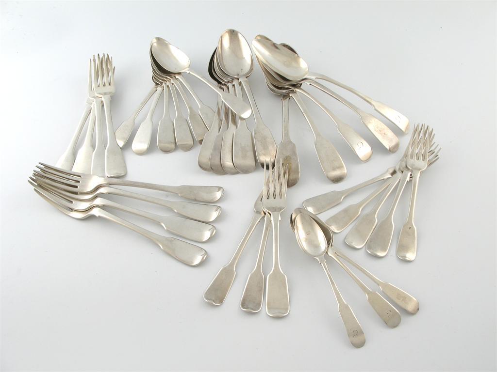 A quantity of antique silver Fiddle pattern flatware, various maker's, London 1802 to 1865, approx. weight 65oz.