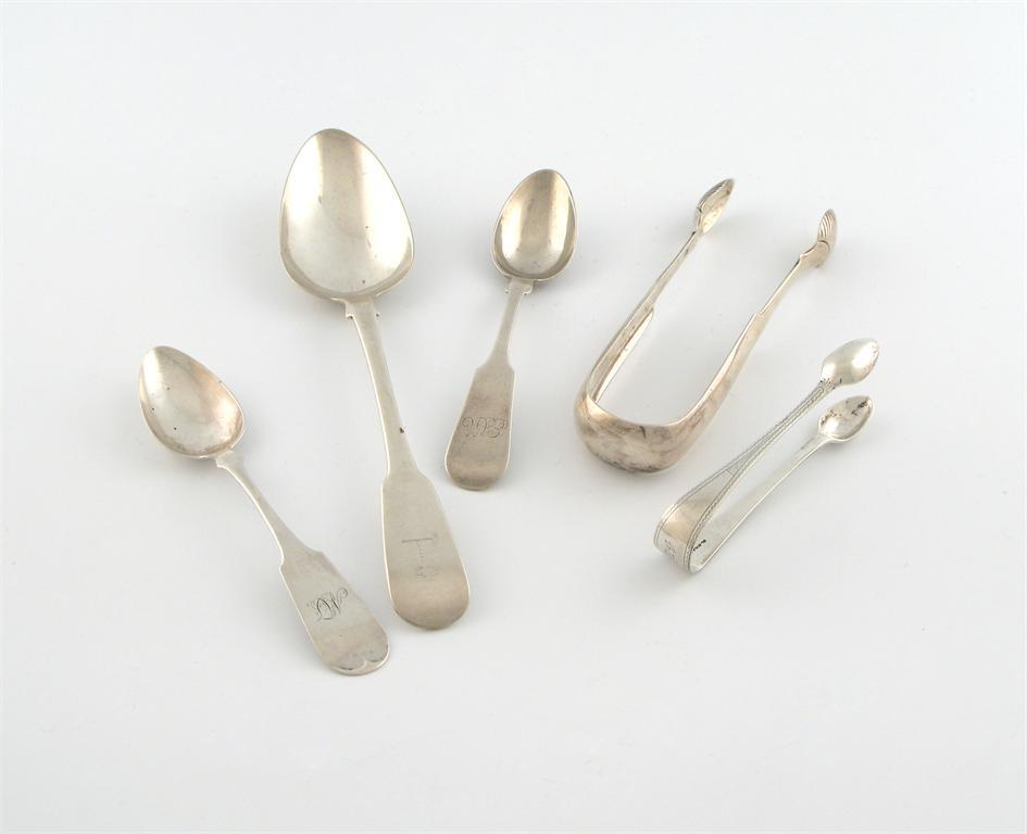 Fiddle pattern dessert spoons, sugar tongs, and two teaspoons, one by Baily & Co, c.1850, and a pair of bright-cut sugar tongs,