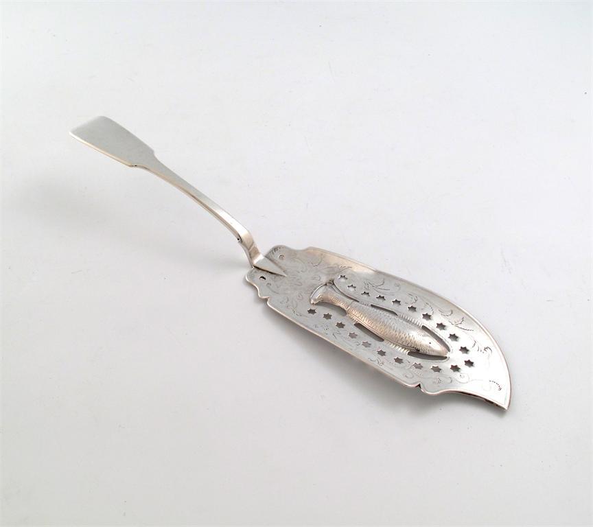 the blade pierced and raised with a fish, bright-cut decoration, length 29.7cm, approx. weight 3.5oz.
