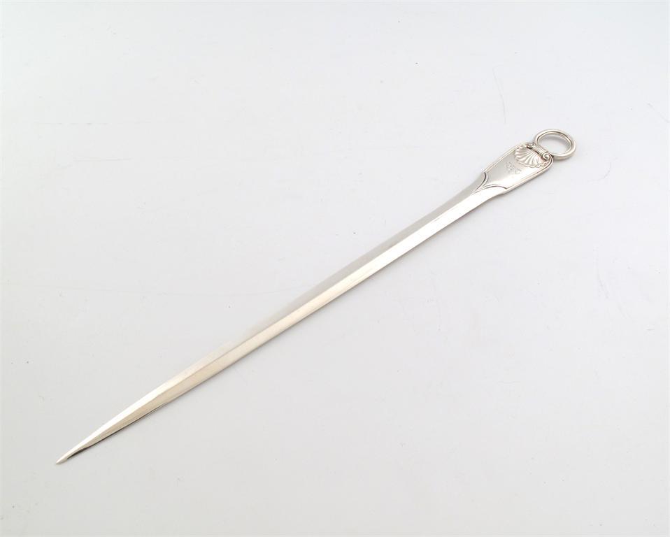 A George III silver Fiddle,Thread and Shell pattern meat skewer, by Paul Storr, London 1818, with a ring handle, the terminal crested, length 35.4cm, approx. weight 4oz.